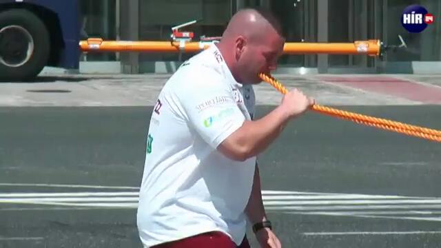Унгарецът Жолт Синка постави нов рекорд и влезе заслужено в "Гинес", след като 40 метра дърпа със зъби 50-тонен самолет. Зрелищният спектакъл станал пред очите на стотина зяпачи на летището в Будапеща. Якият мъж успял да издърпа огромният лайнер А320 само за 52 секунди. На видеото ясно се вижда, че Синка не прави дори усилия, за да изтегли тежката машина, която с лекота потегля след "зъбатия" рекордьор. Мъжагата е наричан от феновете си с любов "Унгарският Попай" заради яките си мускули и здравата си челюст. Синка неведнъж е теглил със зъби тежки транспортни машини. Унгарецът обича да "тренира" с пожарни коли и локомотиви.