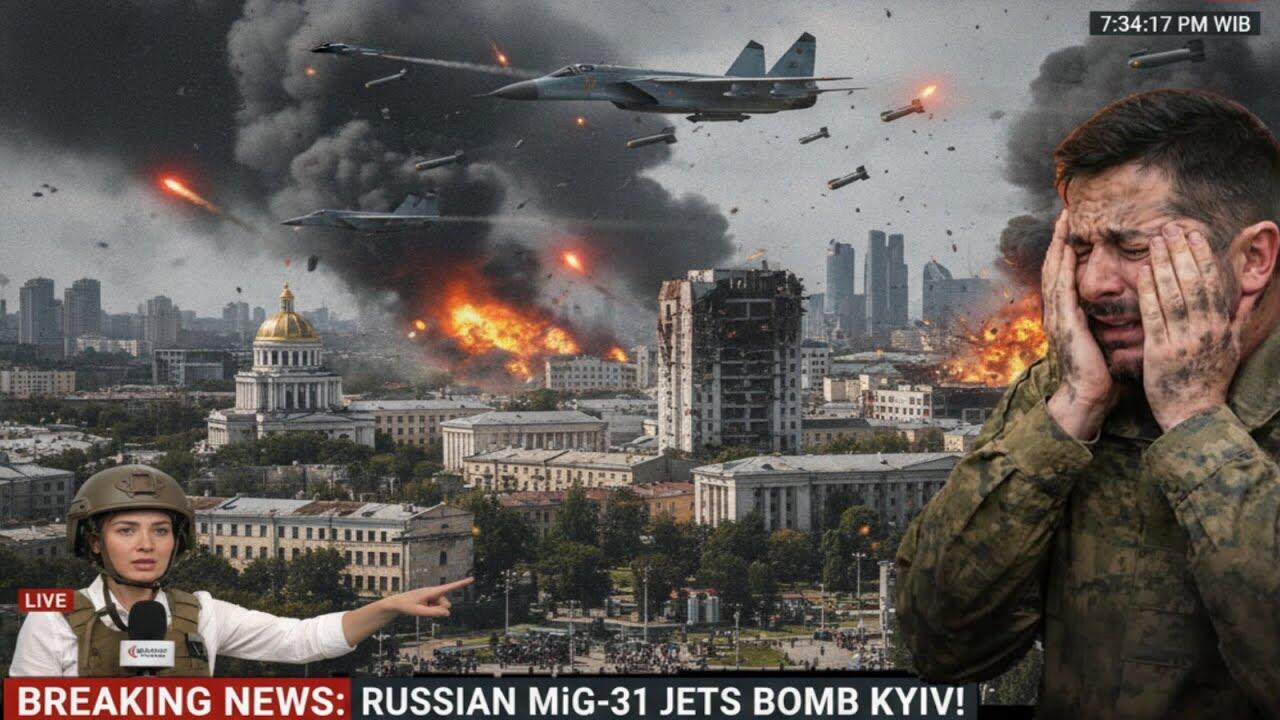 Breaking news–Russian MiG-31 interceptor jets roaring over Kyiv, triggering massive explosions and shockwaves that plunge the city into chaos in this intense fictional scenario.