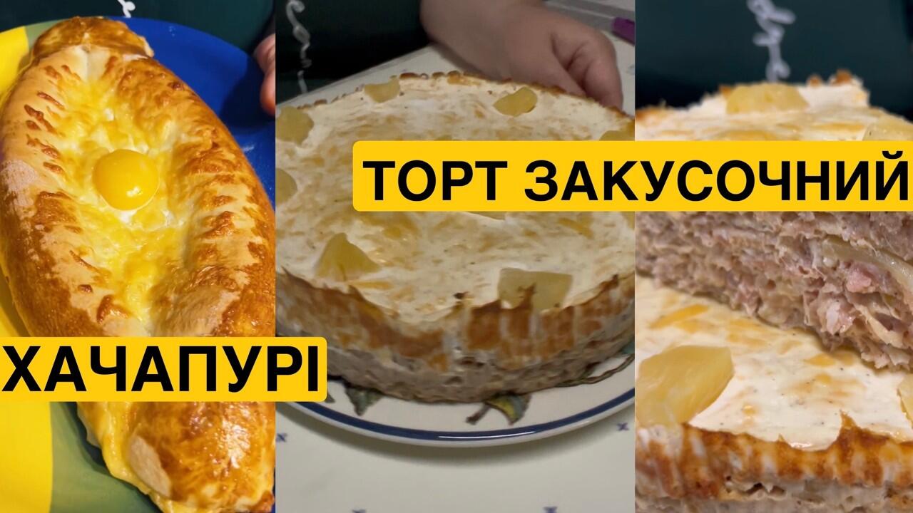 Рецепт : хачапурі : 15 гр свіжі дріжджі ; ч л цукру ; 180 мл вода кімн темпер ; 300 гр борошно ; ч л солі ; ст л олія соняшникова . духовка 180 ; 20-25хв . Закусочний торт : вафельні коржі ; цибуля ; фарш 800 гр ; майонез 2 ст л ; сіль перець за смаком ; вершкове масло 60 гр ; ананаси . Заливка : 2-3 ст л сметани ; яйце ; 100 гр сир твердий . духовка 180 ; 30 хв .