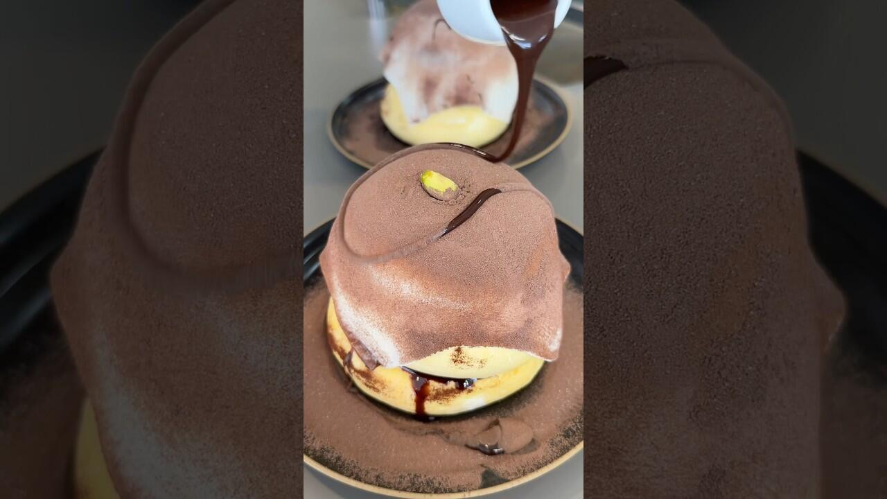 These incredibly light and fluffy pancakes are topped with Dubai chocolate and covered with soft mochi (gyuhi), creating an amazing chewy and fluffy texture.