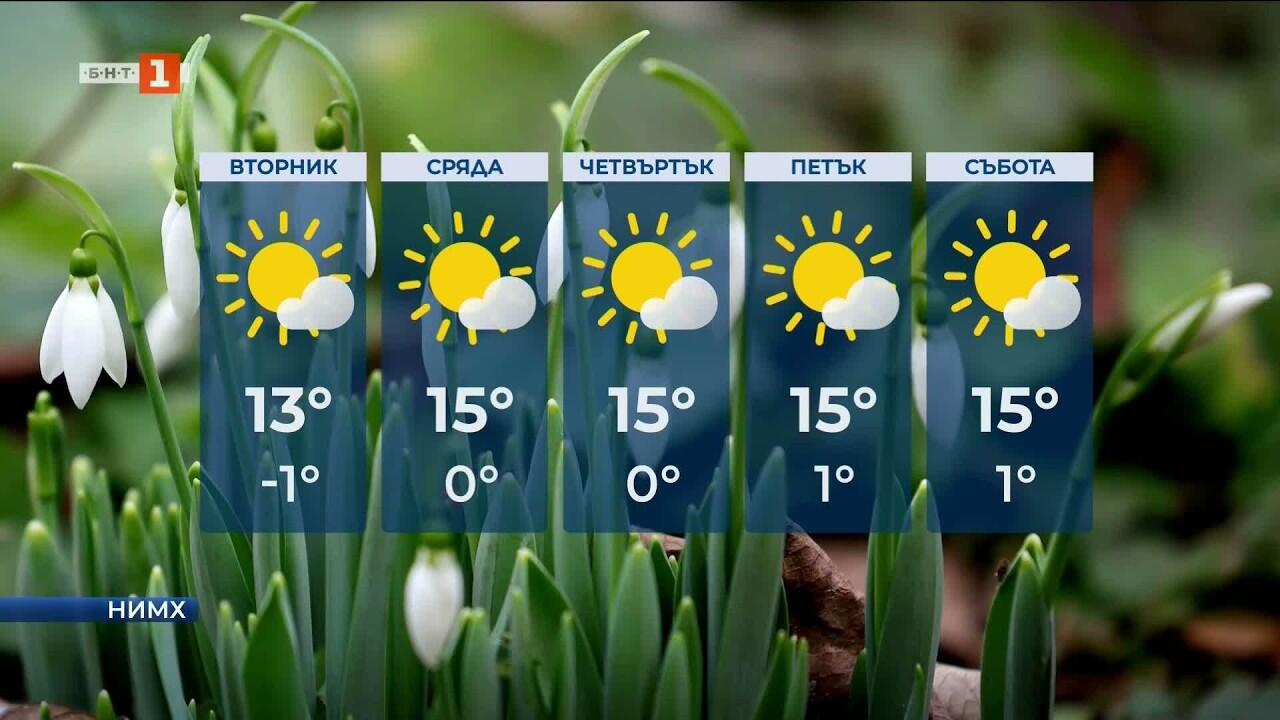 През нощта ще бъде предимно ясно и почти тихо. След полунощ на места по поречията и в низините ще има мъгла или ниска слоеста облачност. Минимални температури ще бъдат между минус 3° и 2°, в София – около минус 1°. Преди обяд на места по поречията и в низините все още ще има ниска слоеста облачност или мъгла. През деня над по-голямата част от страната ще бъде предимно слънчево, над западните райони с разкъсана висока облачност. Вятърът ще е от изток-североизток – слаб, в източните райони – до умерен. Максимални температури ще са между 12° и 17°, в София – около 13°.