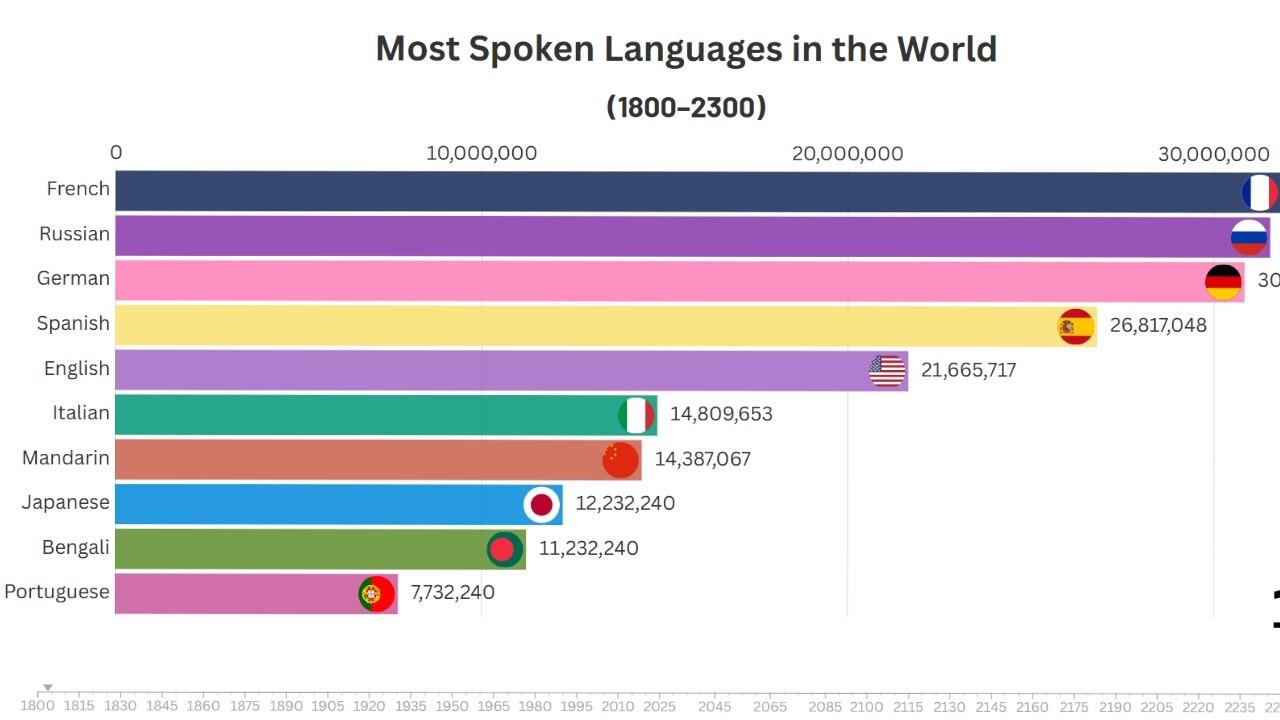 This bar chart race tracks the number of speakers of the world's most spoken languages from 1800 to 2300 — spanning 500 years of linguistic history, present day, and long-range demographic projections.