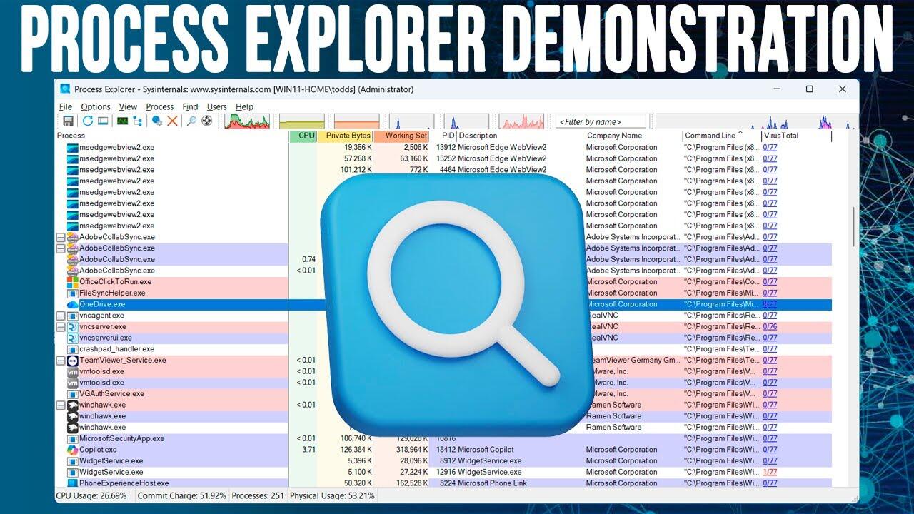 The Sysinternals Process Explorer utility gives you deep visibility into running processes, threads, and system resource usage, far beyond what Task Manager offers. Use it to identify performance bottlenecks, detect malware, and analyze CPU, memory, and DLL activity in real time. This video walks through how to diagnose issues, track down suspicious behavior, and take control of your Windows environment with precision.