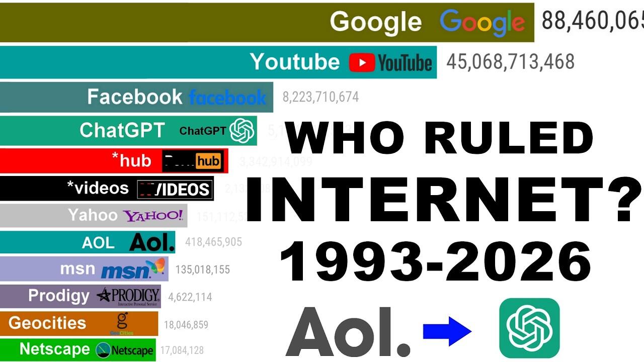 This animated bar chart race shows the continuous battle for the #1 spot, revealing the rise and fall of the biggest websites in history. From the early days of the internet to the modern AI era, discover which platforms ruled, when they peaked, and who ultimately became the most popular website in the world.