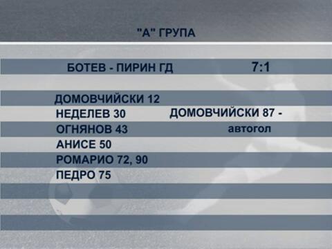 "Ботев" (Пловдив) остава начело в "А" група след внушителна победа със 7:1 над "Пирин" (Гоце Делчев). Два гола за успеха отбеляза Ромарио Кургзорг, по един добавиха Валери Домовчийски, Тодор Неделев, Мариян Огнянов, Анисе и Луис Педро. Домовчийски удари г
