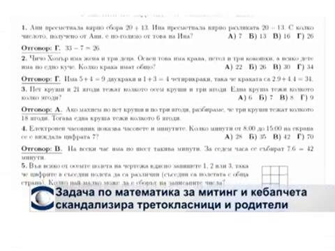 Математическа задача за кебапчета, митинг и знамена скандализира родителите в социалните мрежи. Тя се е паднала на националното състезание по математика "Иван Салабашев" на учениците от трети клас. Освен във Facebook, задачата присъства и на сайта на съст