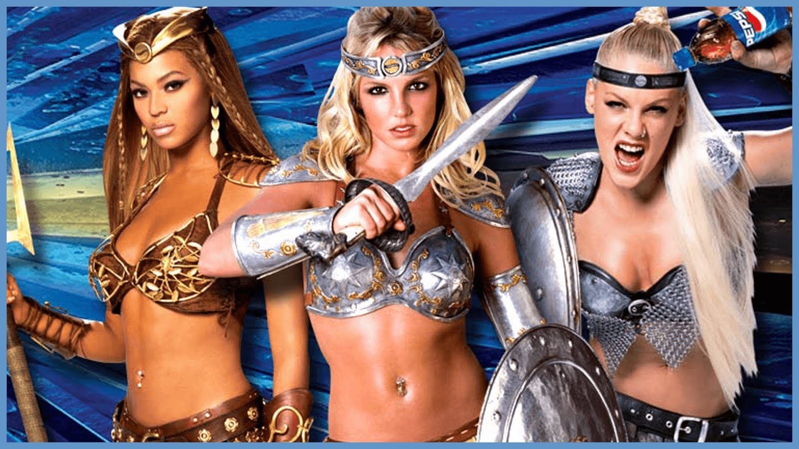 The commercial is set in the Roman Coliseum. A gladiatorial combat between 3 lady gladiators is about to occur. They come out to chants from the crowd but refuse to fight. They drink Pepsi instead and sing We will rock you by Queen.