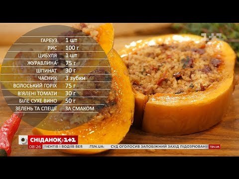 Сьогодні Руслан Сенічкін приготує гарбуз із начинкою - спробуйте! Вам знадобиться: гарбуз - 1 шт, рис - 100 шт, цибуля - 1 шт, журавлина - 75 г, шпинат - 30 г, часник - 3 зубки, волоський горіх - 75 г, в'ялені томати - 30 г, біле сухе вино - 50 г, зелень та спеції за смаком.