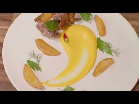 Стъпка 8: Аранжирате красиво чинията с тиквено пюре, парченцата дюля и няколко къса патешко кофи с кожичка. Може да сложите за украса къри листа, дафинов лист, девесил и люта чушка (за любителите).