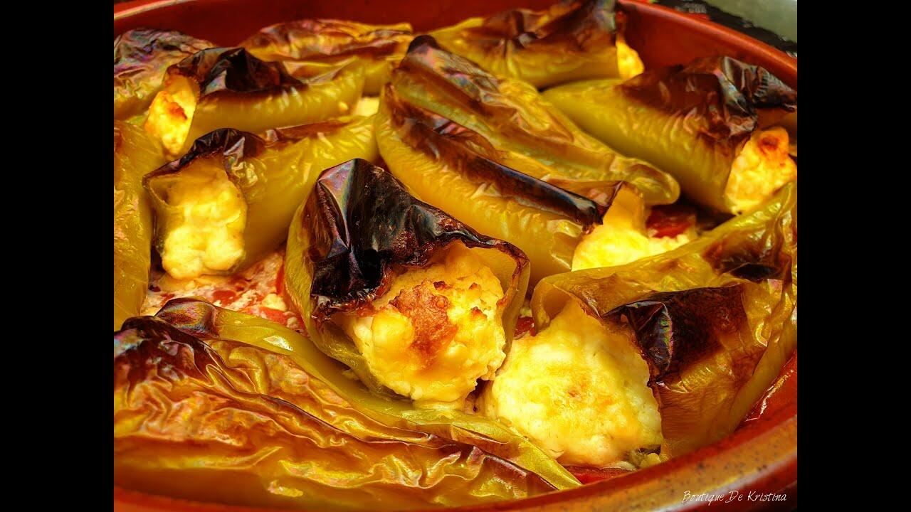 Пълнени чушлета с яйце и сирене, запечени в глина, върху подложка от пресни домати ❤